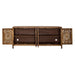 Liberty Furniture Marisol 74 Inch 4 Door Accent TV Stand in Weathered Honey and Soft Wash Gray 2077-AC7432. Marisol 75 accent TV console gives you that Boho chic feel that is so popular today. Boho is a mix of colors, styles, and materials to create a carefree causal comfortable space. Crafted of solid mango with a soft wash grey finish. Features three artisan hand craved doors in a floral pattern, one fixed shelf behind each door, shaped block legs with antique brass knob hardware. Perfect as a TV console.