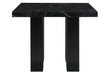 Black Faux marble counter table design with an extra thick top and a double pedestal base with silver connectors.